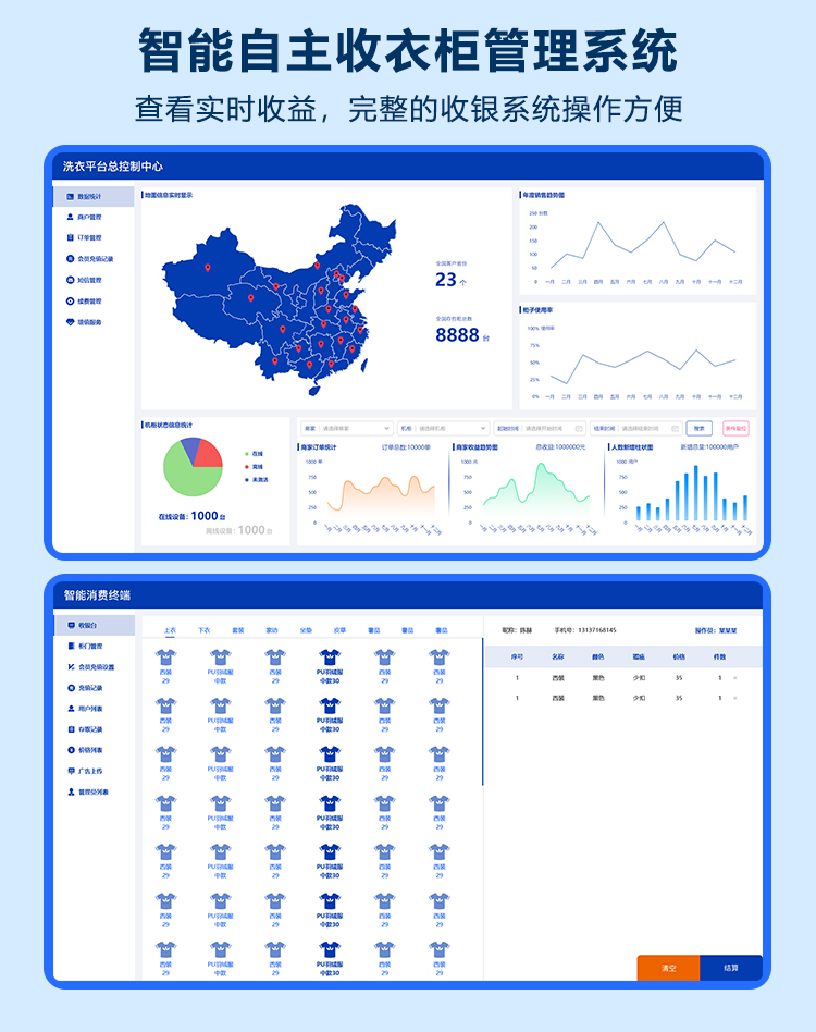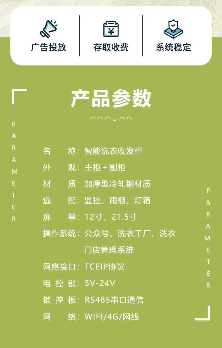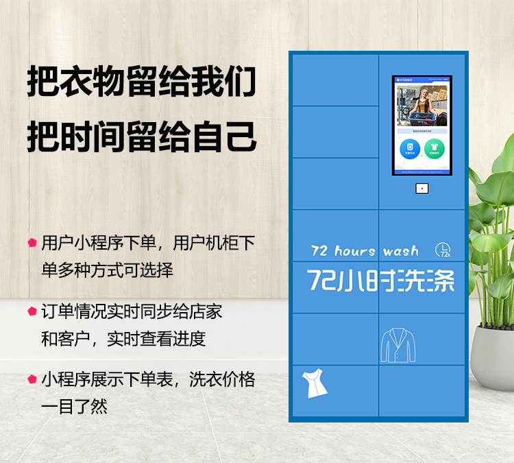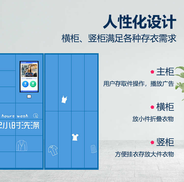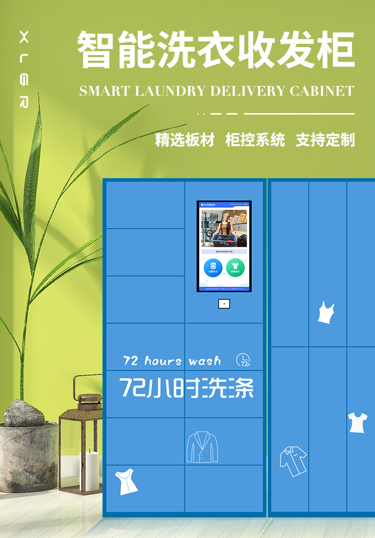 智能洗衣柜是一款集自助收發衣物、家政服務、社區生活服務商城為一體的智能收發柜。主要應用于社區、學校等公眾場合,為用戶提供極簡的洗衣服務。用戶將待洗衣物放置洗衣柜后,商家在管理后臺接到洗衣訂單,安排配送員取衣、干洗完成后配送至智能洗衣柜,并推送信息告知